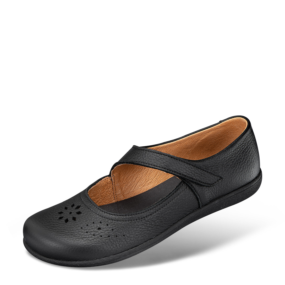 Elegante ballerina van extra zacht elandleer met decoratief perforatiepatroon en verstelbaar riempje voor een perfecte pasvorm. Het model biedt luxe comfort bij elke stap en staat stevig op een antislip PU-lichtgewicht zool.