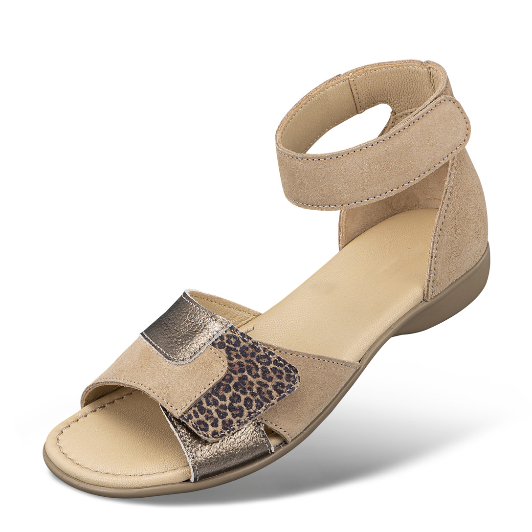 Modieuze sandaal van hoogwaardig leer met chic patchworkgesloten hiel en verstelbare klittenbanden. Met zacht gepolsterdvoetbed en vrouwelijke PU-zool. Voor aangenaam loopcomfort.