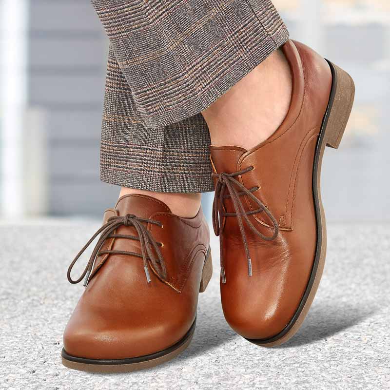 Op de actuele trotteur-zool van TR met vrouwelijke hak: een perfecte veterschoen met goede steun door de klassieke derby-vetersluiting. Van nappaleer naadvrij met een dik gepolsterde rand hoogwaardige textiel voering en een uitneembaar voetbed.