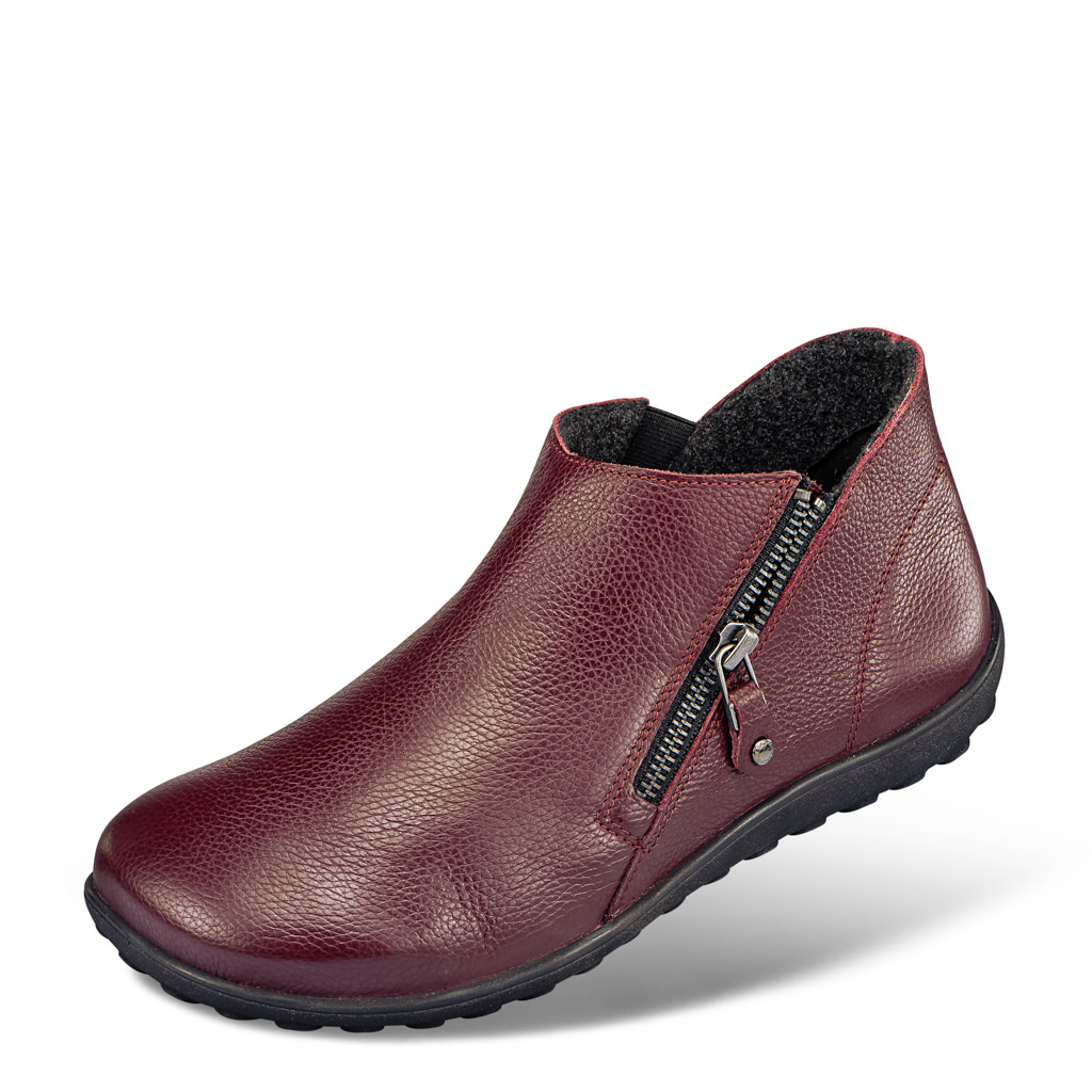 Comfortabele natuurlijke pasvorm van mooi nappaleer naadvrij bij de tenen met ritssluiting en elastische zones aan de binnenkant. Warme microvezel voering en met leer bekleed uitneembaarvoetbed.