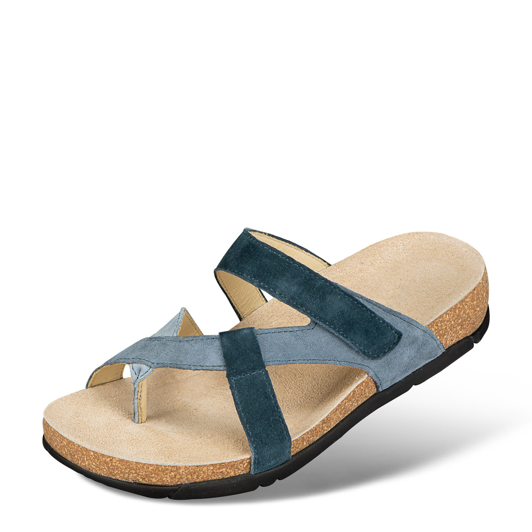 Instapper van zacht puur geitenleer binnenin met een zijdezacht velourseffect. Praktische klittenband op de wreef en meebewegende banden. Met een zacht teenriempje en een leren binnenzool met latex polstering. Lichte kurkzool met PU looplaag.