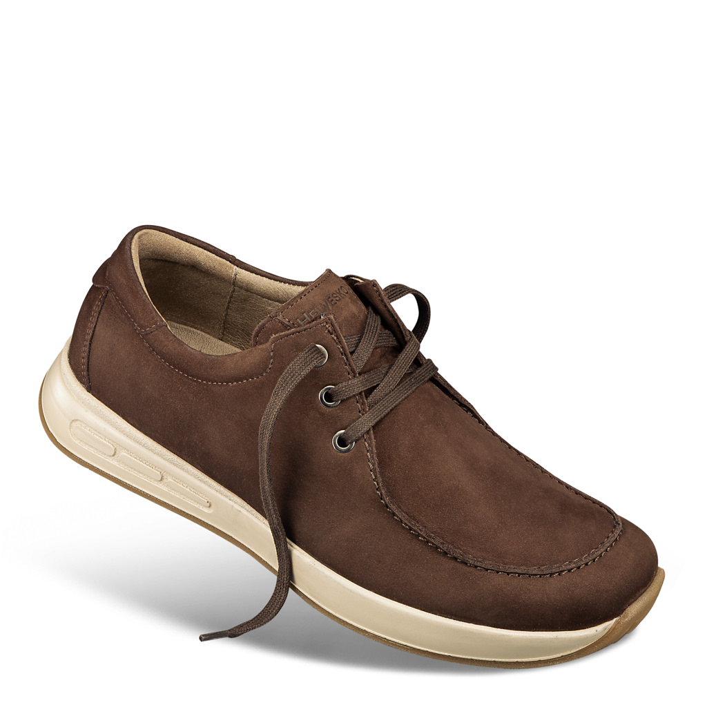Ook met blote voeten en bij gevoelige voeten. Flexibele veterschoen van zacht nubuckleer met luchtdoorlatende voering. Op de soft-move-zool van TPU met uitneembaar voetbed van natuurlijk kurk.