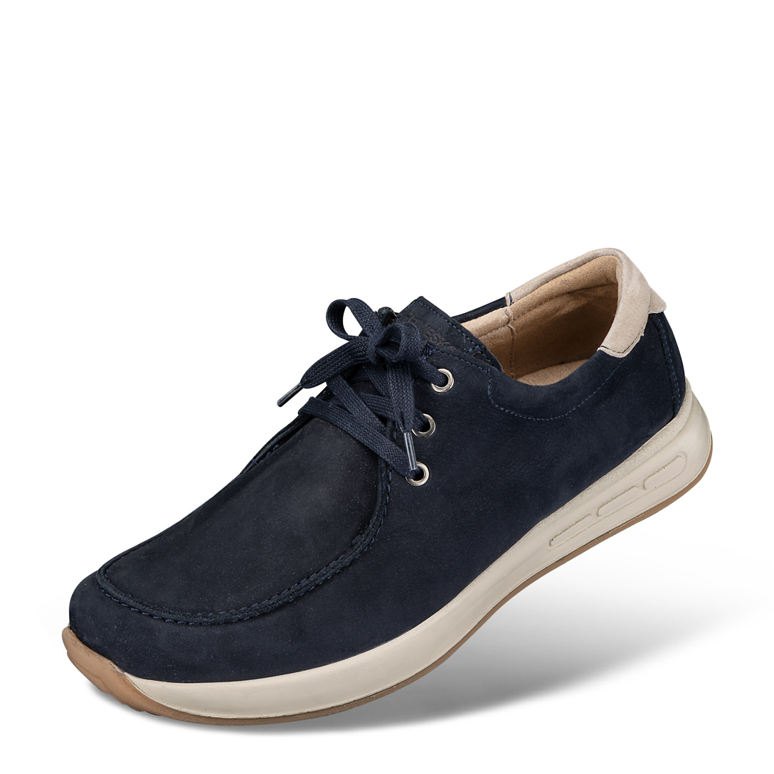 Ook met blote voeten en bij gevoelige voeten. Flexibele veterschoen van zacht nubuckleer met luchtdoorlatende voering. Op de soft-move-zool van TPU met uitneembaar voetbed van natuurlijk kurk.