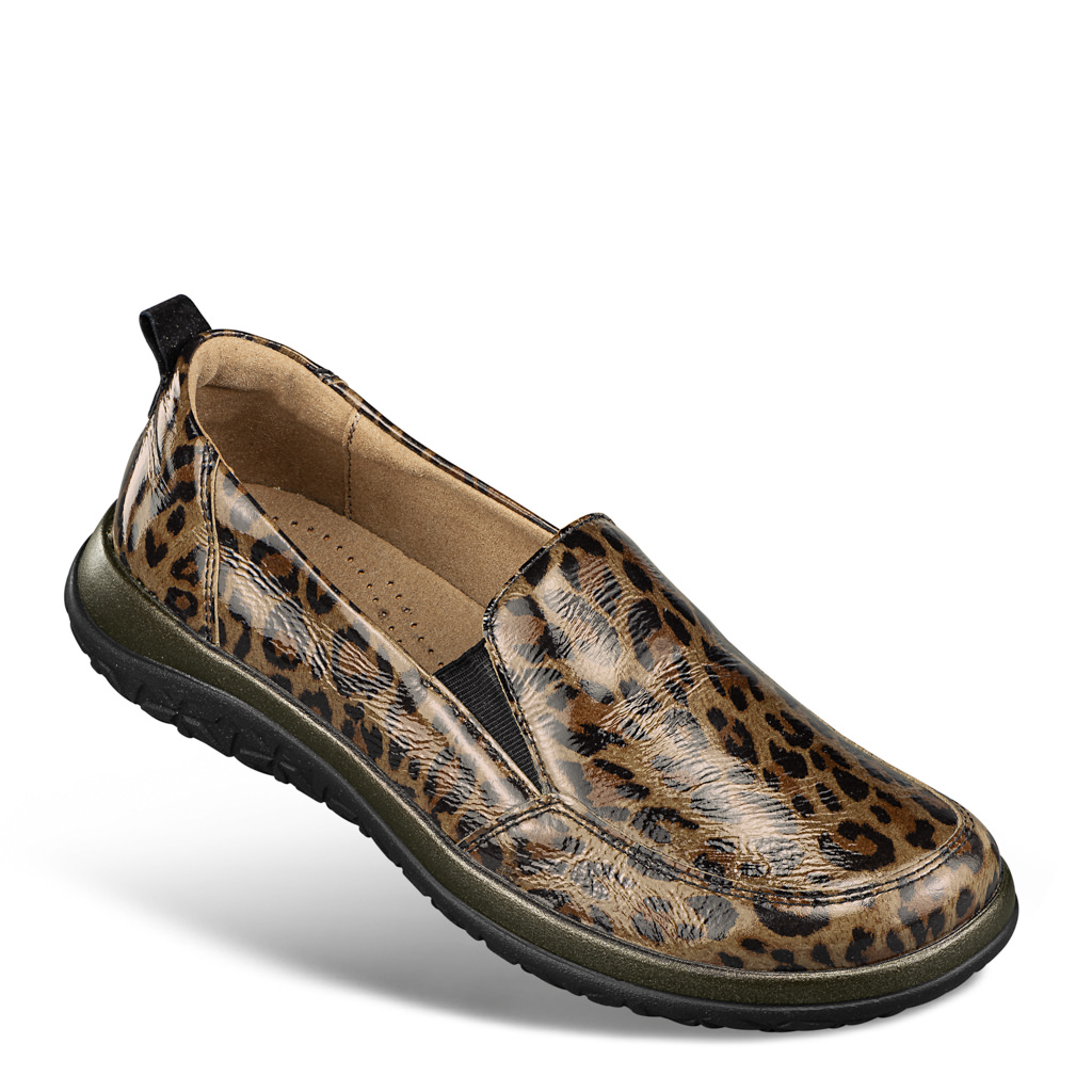 Klassiek in zwart suède of lakleer in luipaard-look? Luxe instapper in de elastische strobelmaakwijze van zacht geitenleer met textiel voering en elastische zones. Dempende comfort-motion-zool vansoft-light-PU met uitneembaar voetbed.
